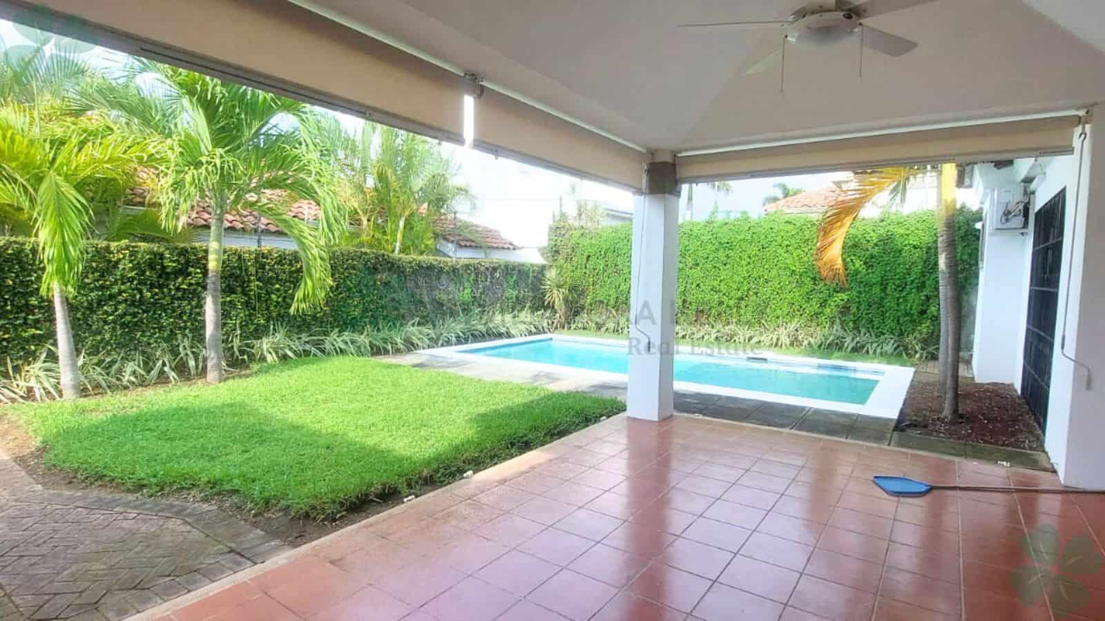 Amplia casa en condominio muy seguro, ubicado en Las Cumbres, cuenta con los siguientes ambientes: 4 dormitorios, 3 1/2 baños, sala, comedor, cocina, sala de estar, dormitorio y baño de servicio, cisterna de agua, terraza, piscina, área de servicio completa, jardín frontal y trasero totalmente engramado, parqueo para varios vehículos, en todas las áreas hay abanicos de techo.